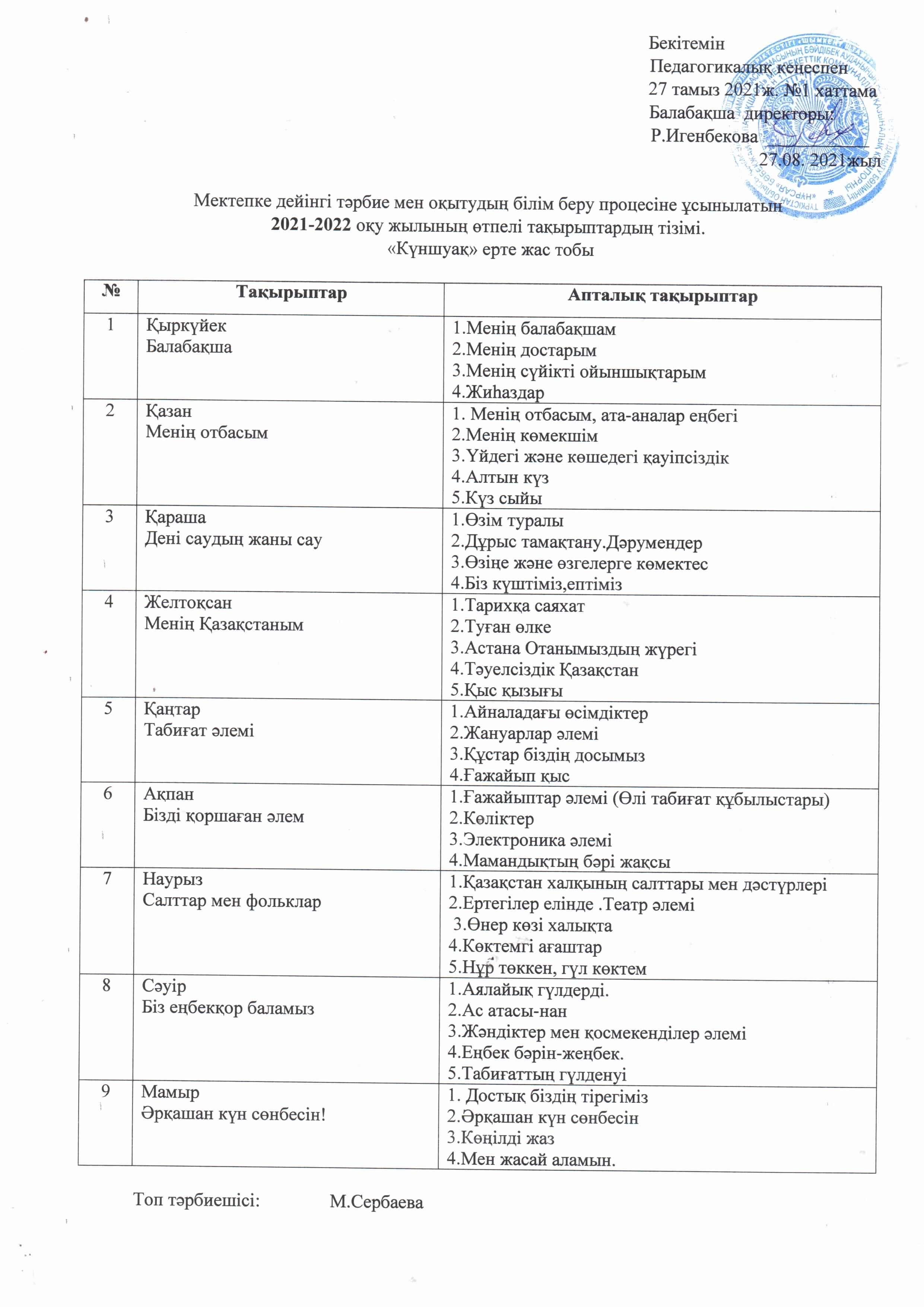 | 1 | Күншуақ ерте жас тобы өтпелі тақырып 21/22 | |